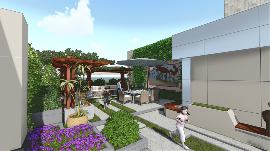 利用主体建筑物的屋顶、平台、阳台、窗台、女儿墙和墙面等开辟绿化场地,并使之有园林艺术的感染力。该设计方案运用因地制宜、以人为本的设计理念,并结合周围环境、时代特色,形式上小而精,力求精美,给人以轻松、愉悦的感受,同时注意环保,即在后期养护管理过程中,枯枝落叶要就地处理并加以利用,为人们提供优美的游憩环境。